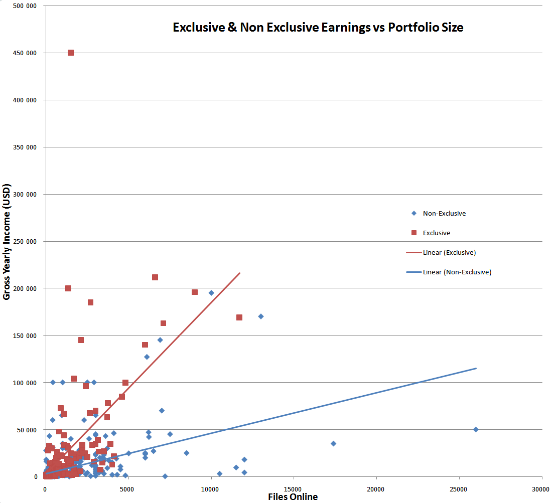 Ого! Проще сказать, я поражен. Я ожидал, что не-эксклюзивные авторы на фотобанке зарабатывают больше эксклюзивных, но график-то показывает совершенно противоположную ситуацию.