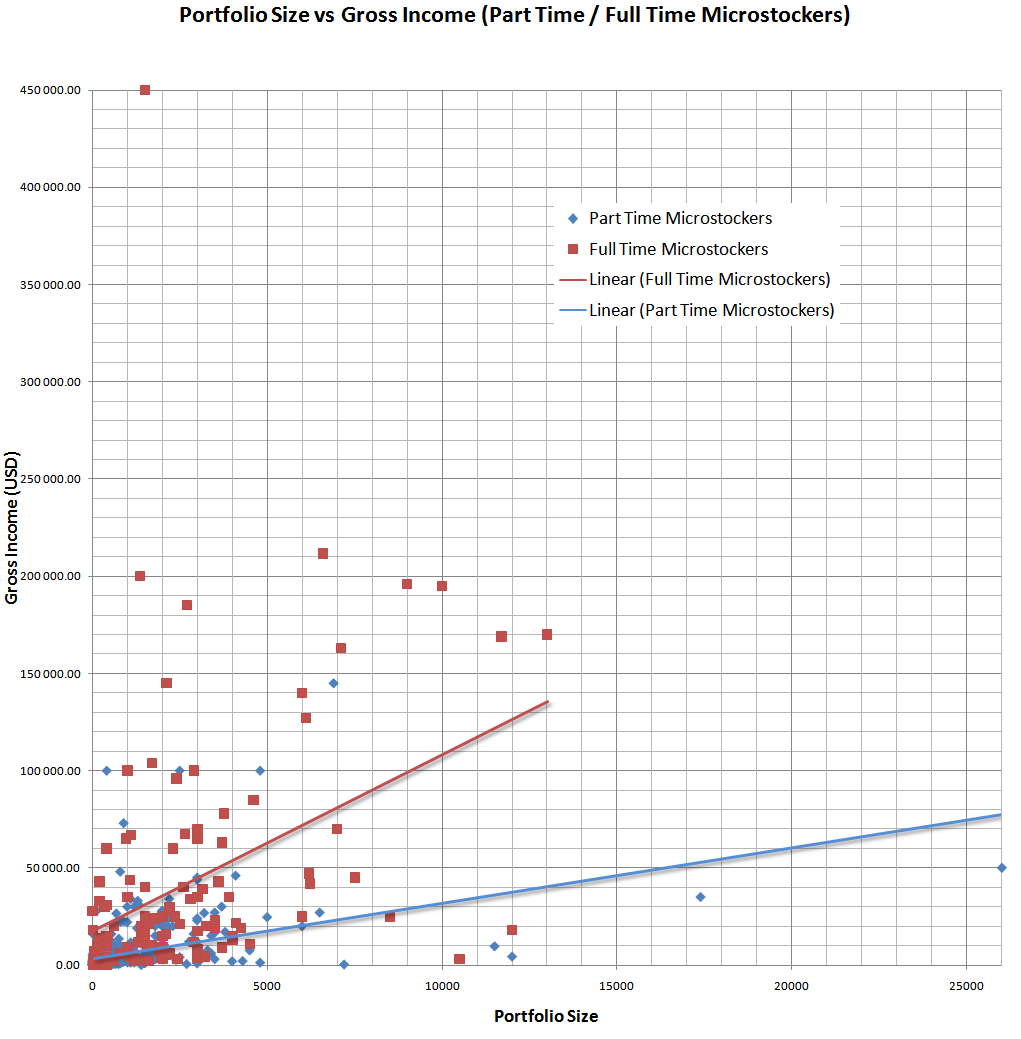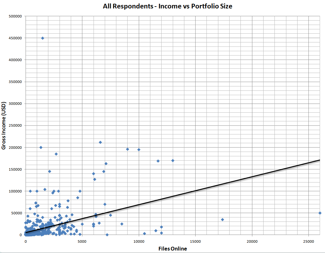 При исследовании особое внимание уделялось уровню заработков микростокеров. На основании полученных данных, Тайлер постарался сделать определенные умозаключения в части того, как размер портфолио взаимосвязан с уровнем заработка стокеров. Ориентируясь на данные выводы, можно примерно попробовать понять какого уровня заработков может ожидать микростокер и вообще, чего он может реально достичь в своей работе.
